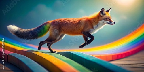 © Aumarin, Obraz premium A vibrant fox with a rainbow-hued tail leaps gracefully across a colorful arc, a whimsical journey of imagination and color