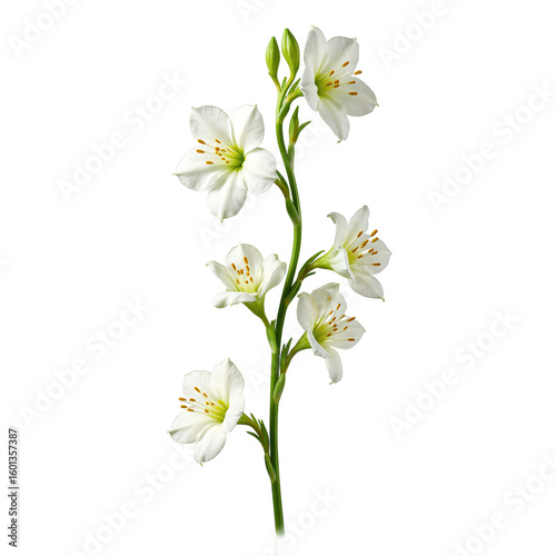 © Ruben, Obraz premium A vibrant freesia stem showcasing multiple colorful blossoms elegantly centered and isolated on a clean white background
