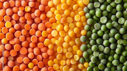 Fototapeta premium A vibrant, frosted medley of peas, carrots, corn, and beans, spread evenly...