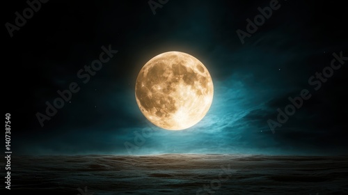 Fototapeta premium A vibrant full moon casts a golden glow over a dark and moody landscape,...