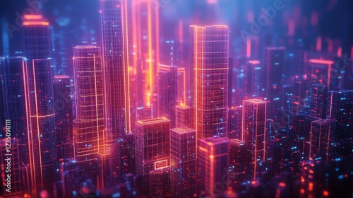 Fototapeta premium A vibrant, futuristic city skyline illuminated with neon lights and digital...