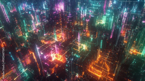 Fototapeta premium A vibrant, futuristic cityscape filled with neon lights and digital elements.