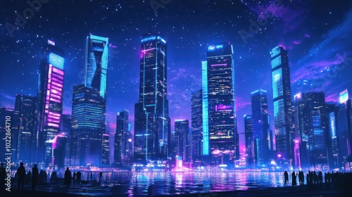 Obraz premium A vibrant futuristic cityscape illuminated by neon lights under a starry sky.