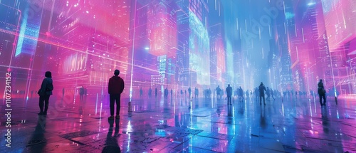 Obraz premium A vibrant, futuristic cityscape illuminated with neon lights, showcasing silhouettes of people amidst colorful reflections and a digital atmosphere.