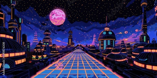 Obraz premium A vibrant, futuristic cityscape under a starry sky with a large moon,...
