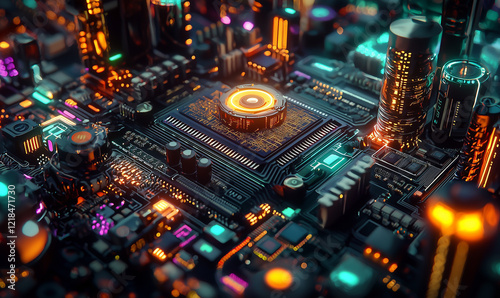 Fototapeta premium A vibrant, futuristic cityscape with glowing circuitry and intricate patterns...