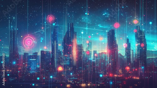 © munawaroh, Obraz premium A vibrant, futuristic cityscape with glowing elements and a starry sky.