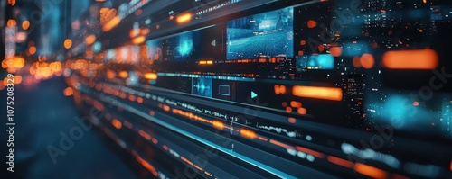Fototapeta premium A vibrant, futuristic digital display showcasing flowing data streams and glowing graphics.
