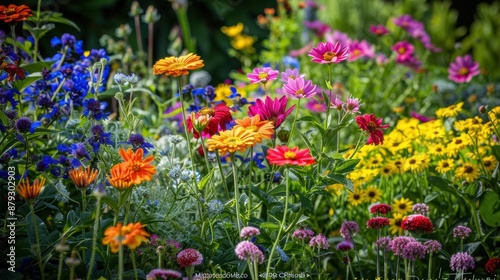 Fototapeta premium A vibrant garden filled with blooming flowers of various colors and species on a sunny day