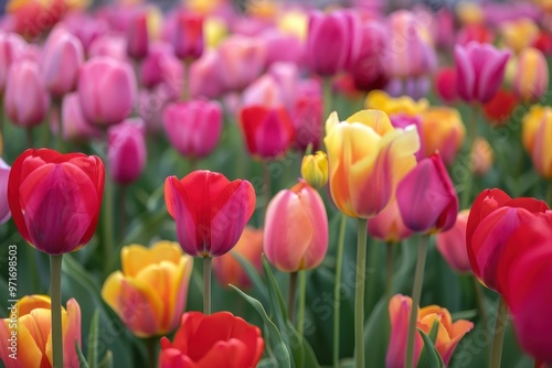Fototapeta premium A vibrant garden filled with blooming tulips in various colors during a sunny...