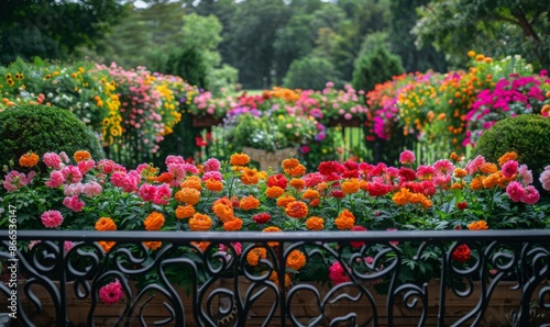 Fototapeta premium A vibrant garden full of blooming flowers, seen from a balcony with wrought iron railings