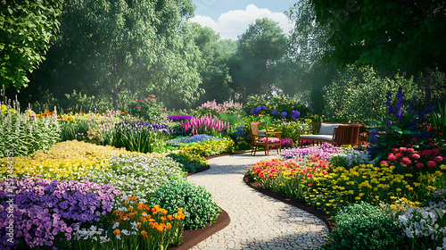 Fototapeta premium A Vibrant Garden Path Lined with Colorful Flowers and Serene Seating