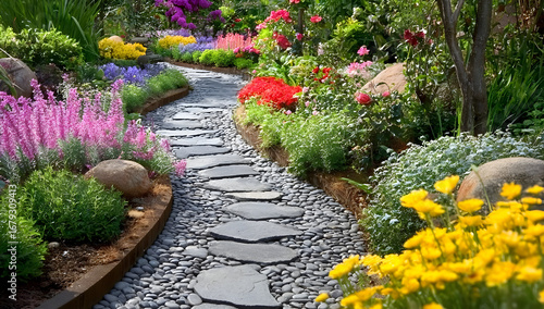 Obraz premium A vibrant garden pathway adorned with colorful flowers and lush greenery....