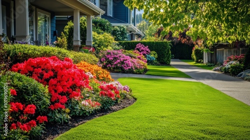 © BerkahStock, Fototapeta premium A vibrant garden pathway lined with colorful flowers and lush green grass.
