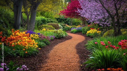Naklejka premium A vibrant garden pathway surrounded by colorful spring blooms and greenery.