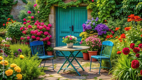 Fototapeta premium A vibrant garden scene featuring a table and chairs, surrounded by colorful flowers and a blue door, garden, table, chairs