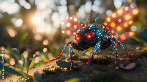 Fototapeta premium A vibrant, glowing insect with luminous wings and red eyes perched on a mossy surface in a sunlit forest setting