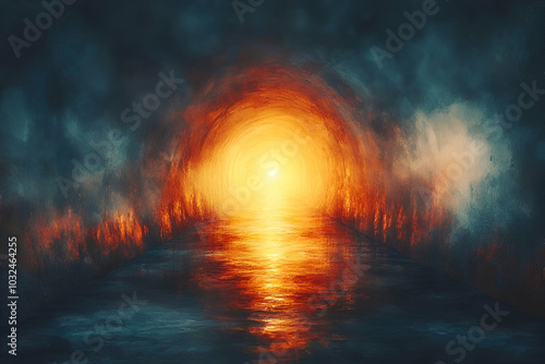 © Butsarakham, Fototapeta premium A vibrant, glowing orange light emerges from a dark, misty background, reflecting on a calm surface, creating a mysterious and ethereal atmosphere.