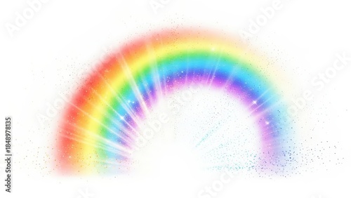© Zumroatun, Obraz premium A vibrant, glowing rainbow arching across a white background with a bright, sparkling light emanating from its center.