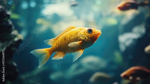 Naklejka premium A vibrant goldfish swimming gracefully in a serene aquatic environment.
