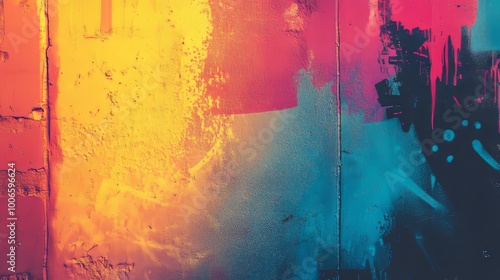 Naklejka premium A vibrant graffiti artwork featuring a blend of bright golden, blue, and pink hues on a textured concrete surface.