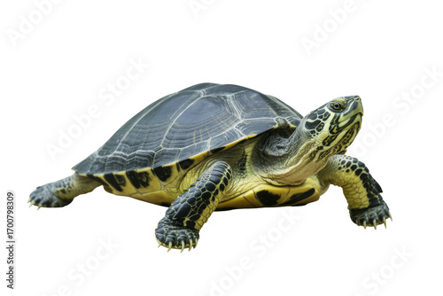 Obraz premium A vibrant green and black turtle with sharp claws, isolated on a transparent...