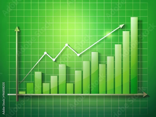 © Anchalee, Fototapeta premium A vibrant green bar chart representing growth and progress in data visualization, featuring ascending values and a dynamic trend line.