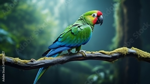 Obraz premium A vibrant green, blue, and red parrot perched on a moss-covered branch in a...