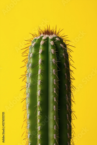 Naklejka premium A vibrant green cactus with sharp spines is strikingly set against a solid yellow backdrop.