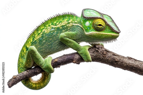 © Alokya, Obraz premium A vibrant green chameleon perched upon a simple wooden branch