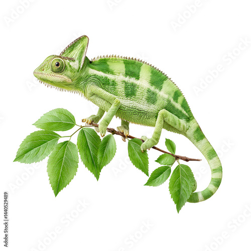 © T.Raw Visuals, Obraz premium A vibrant green chameleon with unique skin pattern clings to a leafy branch.