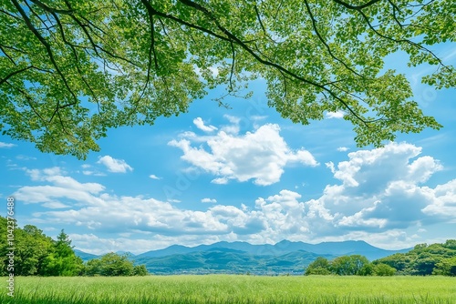 © StockUp, Fototapeta premium A vibrant green field stretches towards distant mountains under a clear, blue sky with scattered clouds overhead.