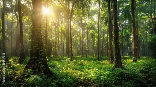 Obraz premium A vibrant green forest scene with sunlight filtering through the dense canopy creating a peaceful and serene atmosphere