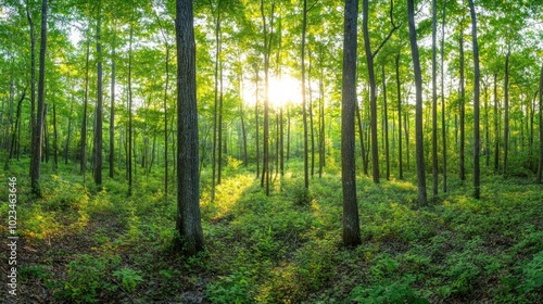 © logyartstudios, Obraz premium A vibrant green forest with tall trees and a sun shining through the canopy.