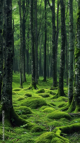Fototapeta premium A vibrant green forest with tall trees and moss-covered trunks under a serene...