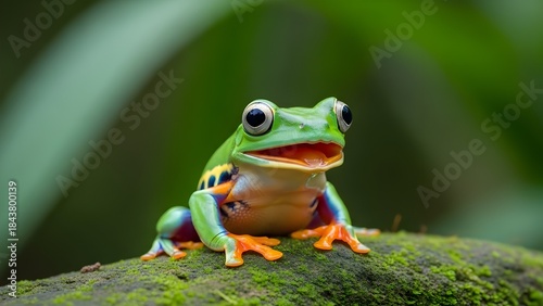 © Tasmim, Naklejka premium A vibrant green frog perched on a mossy rock in a lush environment