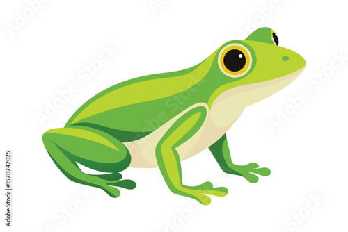 © Orpita, Naklejka premium A vibrant green frog with large yellow eyes sits on a white background