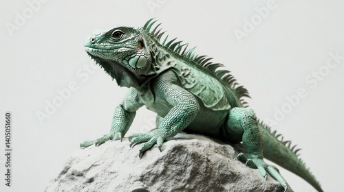 © SlashStd, Obraz premium A vibrant green iguana perched atop a light gray rock.