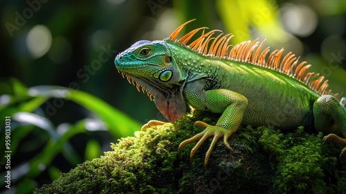 Fototapeta premium A vibrant green iguana perched on mossy rocks in a lush environment.