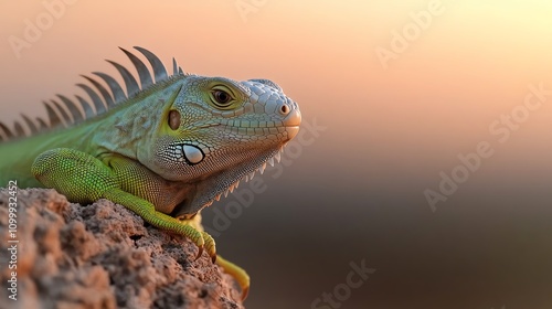 © Moviebirth, Fototapeta premium A vibrant green iguana sunbathing on a rocky ledge