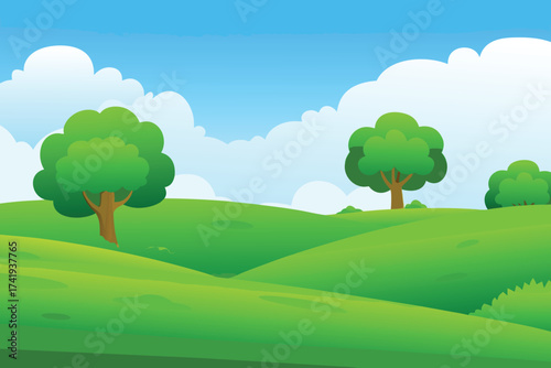 © MAYENUDDIN, Fototapeta premium A vibrant green landscape featuring rolling hills and fluffy white clouds