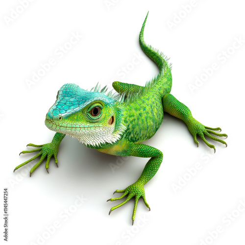 Fototapeta premium A vibrant green lizard with a blue head, showcasing intricate textures and colors, poses against a white background.