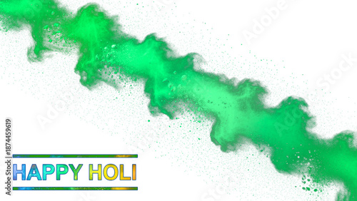 © J.G Studio, Fototapeta premium A vibrant green powder explosion on a black background with Happy Holi text on transparent background