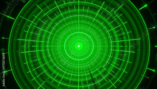 © Watcharkorn, Fototapeta premium A vibrant green radar screen pulses with activity, oscillations, electronic