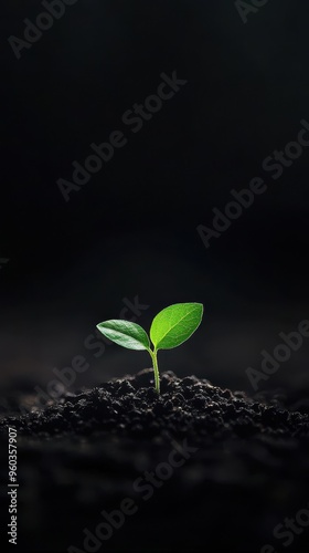 Naklejka premium A vibrant green seedling emerging from dark soil, symbolizing growth,...