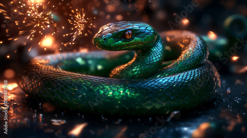 Fototapeta premium A vibrant green snake coiling on a dark surface surrounded by sparkling...