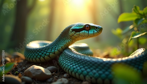 Fototapeta premium A Vibrant Green Snake in its Natural Habitat with Sunlight Filtering Through...