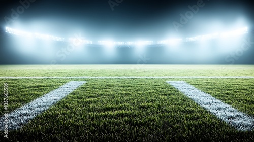 Obraz premium A vibrant green stadium field illuminated brightly by stadium floodlights