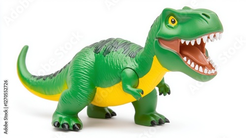 Obraz premium A vibrant green toy dinosaur with a yellow belly and an open mouth,...