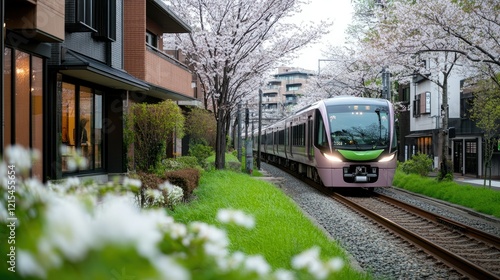 Naklejka premium A vibrant green train glides gracefully along a track adorned with blooming cherry blossoms, set against an urban backdrop on a tranquil spring morning